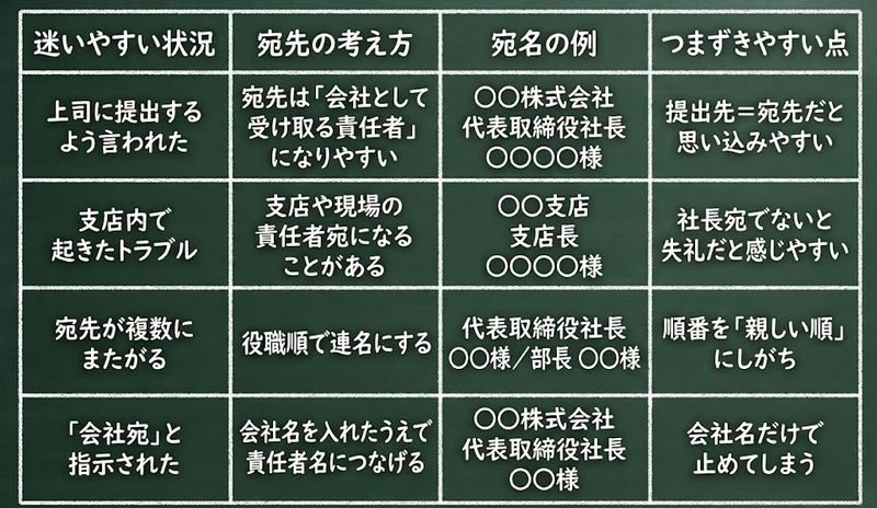 始末書の宛先って、ふだん使わないルールが一気に出てくるので、そこで手が止まりやすいですよね。