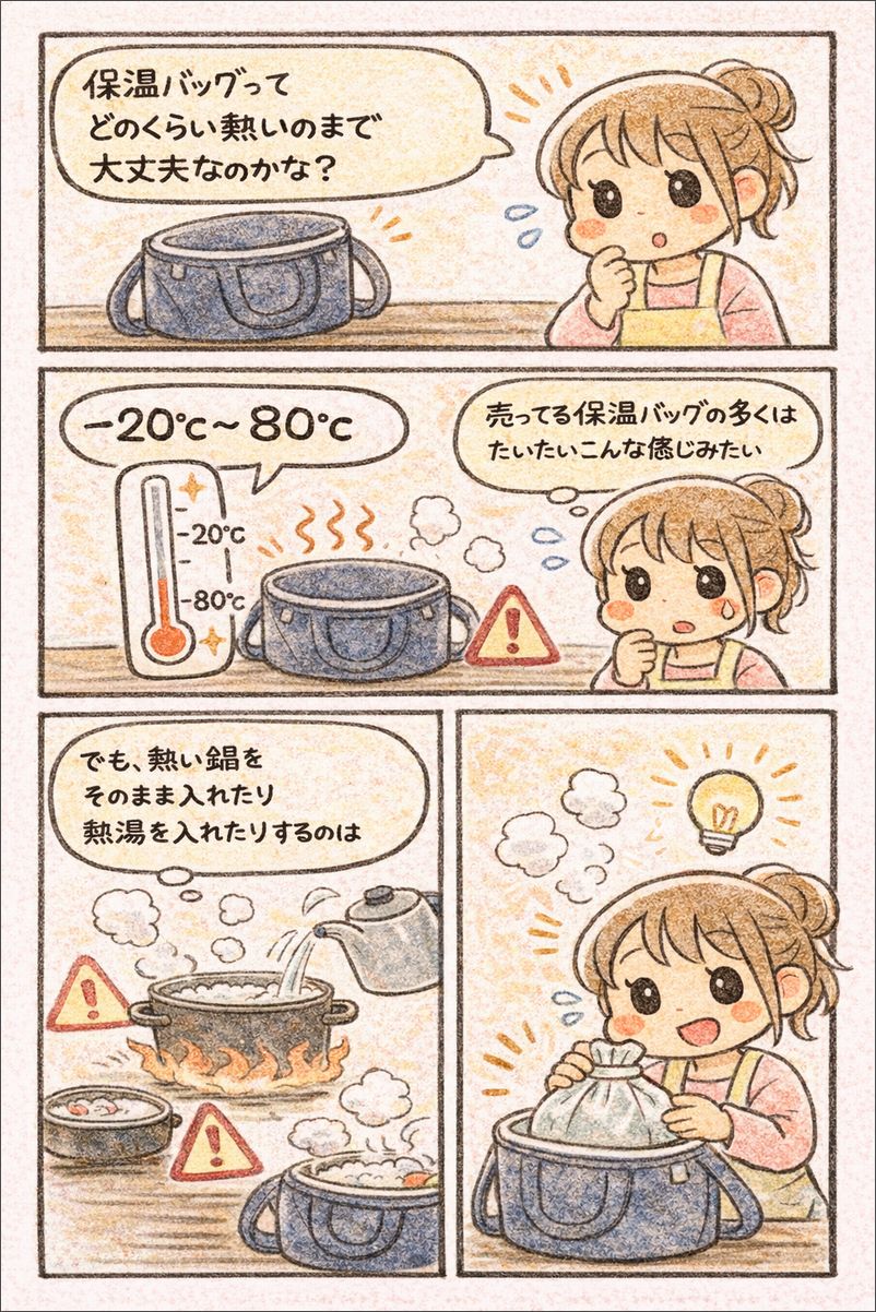 でも、一般的に売られている保温バッグであれば「―20℃~80℃」程度だそうです。