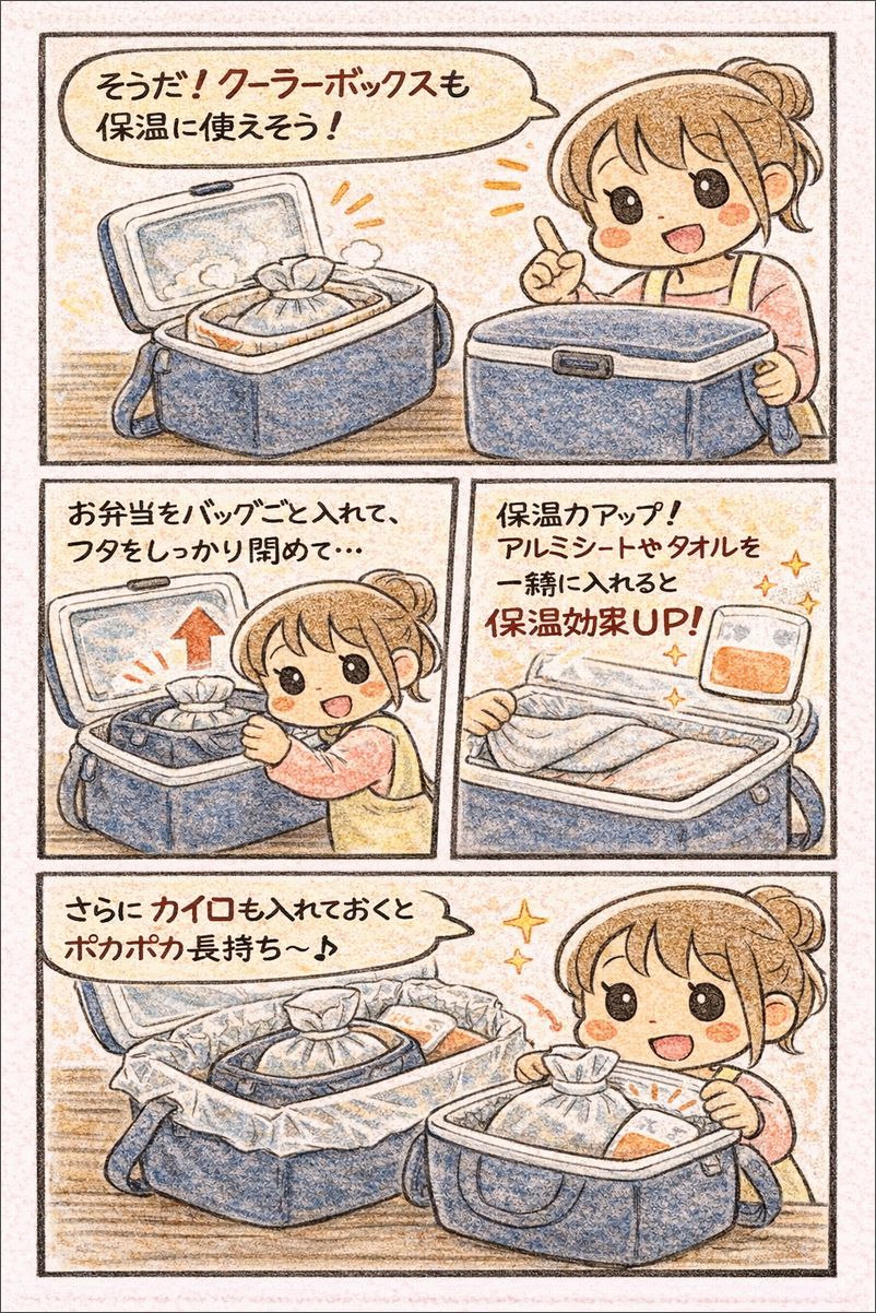 - クーラーボックスも保温効果が期待できますが、本来の用途外での利用だと認識した上で、安全に使うようにしてください。(保冷・保温両用のクーラーボックスが安心です)