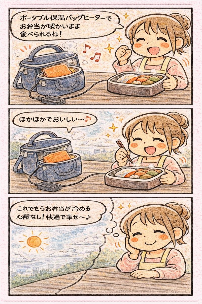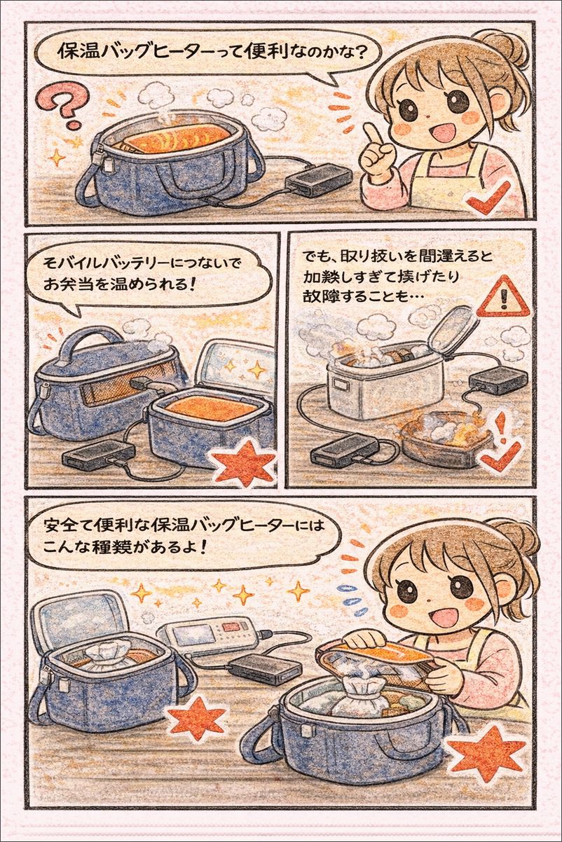 あなたの「「バッグヒーター付きの保温バッグ選び」の参考にしてみてくださいね。