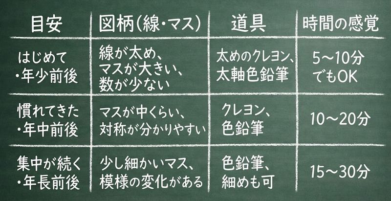 保育の場では、図形や模様を“教材”にしつつ、子どもが安心して集中できる制作遊びとして取り入れる、くらいの距離感がちょうどいいですよ。