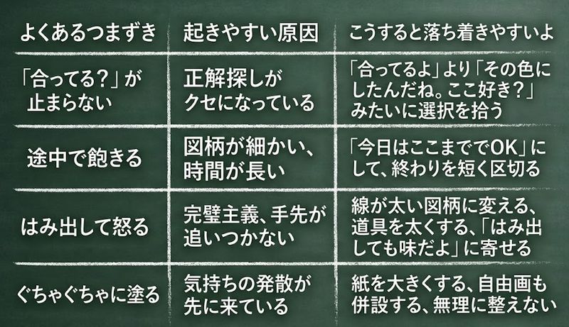 実際にやってみると、上手に塗ることよりも「自分で選んで、落ち着いて手を動かす時間」そのものが大事になりやすい遊びです。