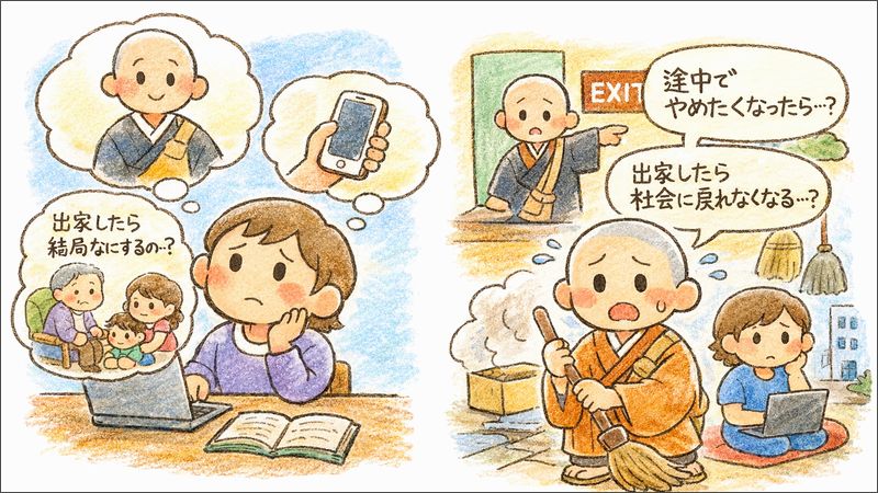 出家に少し心が動いたのに、「結局なにをするの?」「仕事や家族はどうなるの?」って不安が先に立つと、その時点で立ち止まっちゃいますよね。