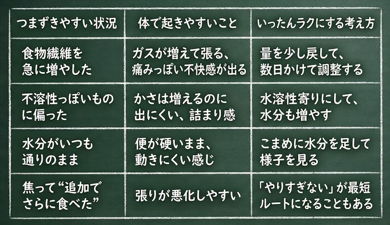 食物繊維だけ頑張ると、逆に苦しくなりやすいです。