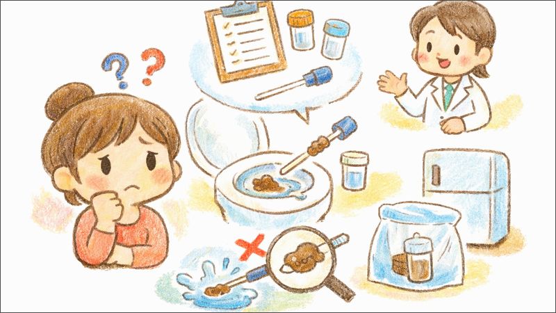 逆に、水状で棒に付かないときや、混入が強く疑われるときは、無理に出すより提出先に確認したほうが安心です。