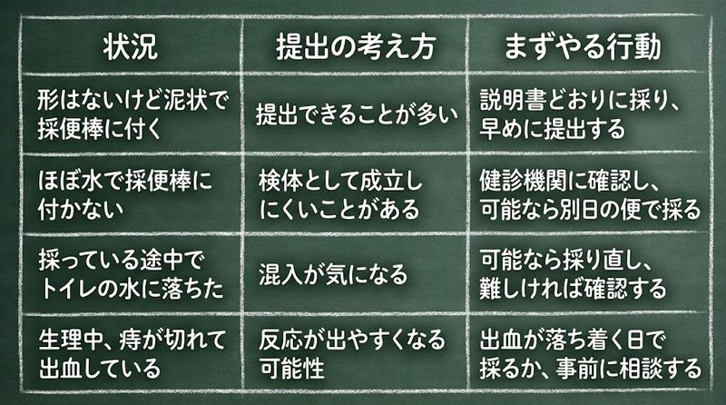 下痢っぽい便でも、採便棒で採れて、提出期限と保管ルールを守れるなら、提出できることが多いです。