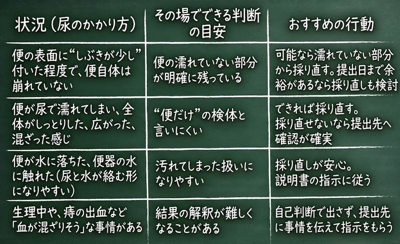 尿がかかった便を提出していいかは、「どのくらい混ざったか」と「検査の種類」で対応が変わります。