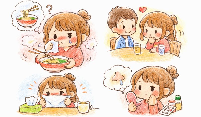 温かいものを食べたときの鼻水は、風邪とは限らずに、食事の刺激で鼻が反応する「食事性鼻漏(非アレルギー性鼻炎の一種)」として説明されることがあります。