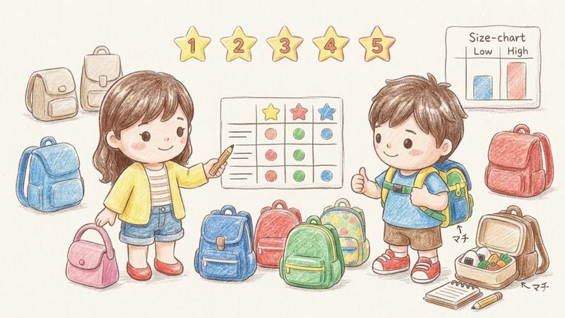 - 容量は「今の身長と体格」に合わせ、低学年は12〜15L・高学年は20〜25L前後を目安にする