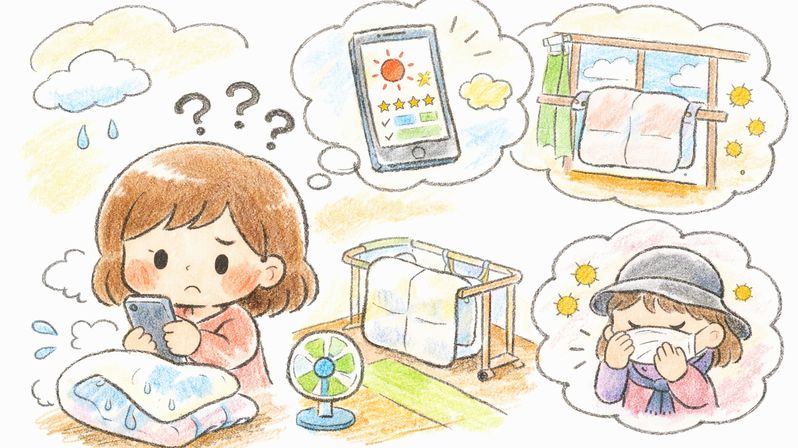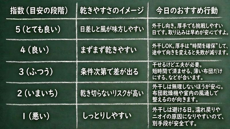 数字やランクだけ見てもピンとこなくて、干したのに夕方しっとりしてガッカリしたり、逆に迷って干せずに終わったり。
