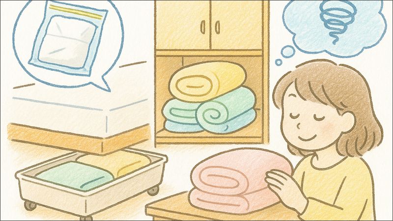 あとは、シーツを直接棚に置くのではなく、通気性のある袋やケースに入れておくだけでも、湿気との距離がぐっと取れるようになりますよ。